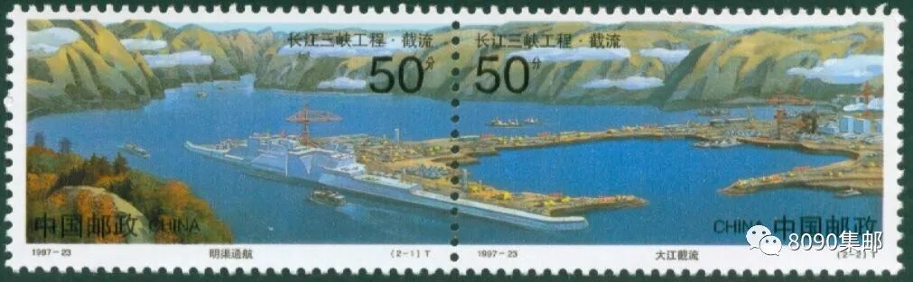 经过近三年的建设,1997年11月8日,三峡工程胜利实现大江截流,第一阶段建设目标完成。同日发行的邮票,也忠实的记载下,大江截流的工程瞬间。