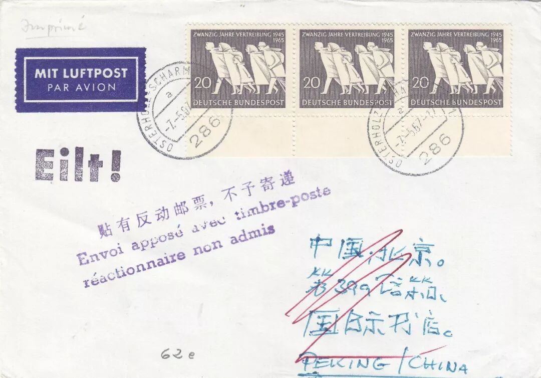 这套邮票虽然与中国无任何关联,但与同在社会主义阵营的波兰、捷克斯洛伐克、匈牙利、罗马尼亚、南斯拉夫等国家有关,为维护社会主义阵营的团结和统一,中国邮政遂将此项邮票定性为反动邮票,北京国际邮局专门刻制一款“贴有反动邮票,不予寄递”中法双文字邮政副戳加盖在贴有该邮票的进口邮件上,本文开篇的实寄封由德国1967年5月寄北京国际书店,被加盖此副戳后退回。