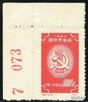 早期老纪特邮票的成品顺序号也有使用红色油墨、工号用1位数字表示的(图二)。