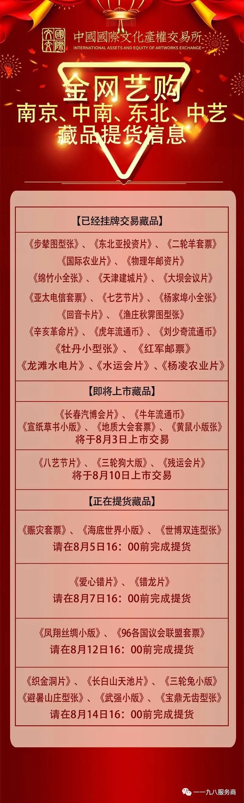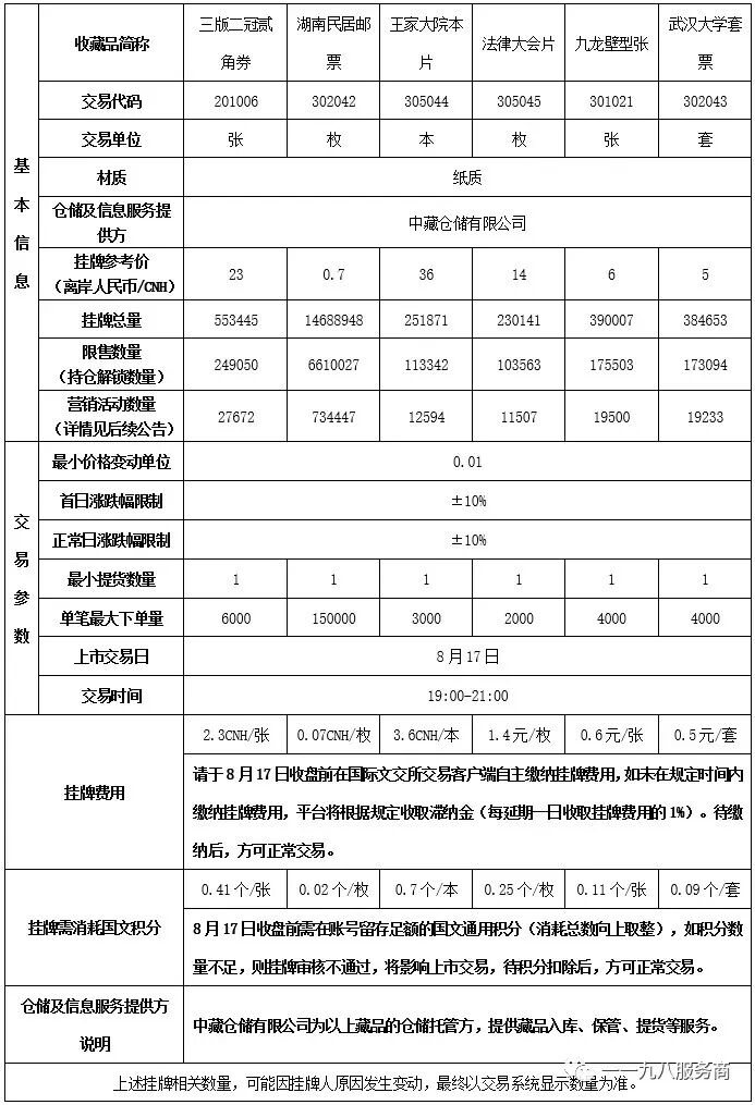 根据2020(交)第332号公告,《三版二冠贰角券》、《湖南民居邮票》、《王家大院本片》、《法律大会片》、《九龙壁型张》、《武汉大学套票》已符合本所晚盘平移板块挂牌要求,现准予在晚盘平移板块正式挂牌交易,具体事项公告如下: