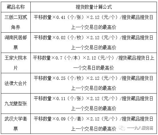 假设:某交易商平移挂牌《三版二冠贰角券》共1000张,则所需挂牌积分为410个(1000*0.41=410),计划今日提货《步辇图型张》以抵扣挂牌积分,《步辇图型张》昨日最高价为113.12CNH/张,则今日《步辇图型张》提货数量=410*2.12/113.12≈8张。