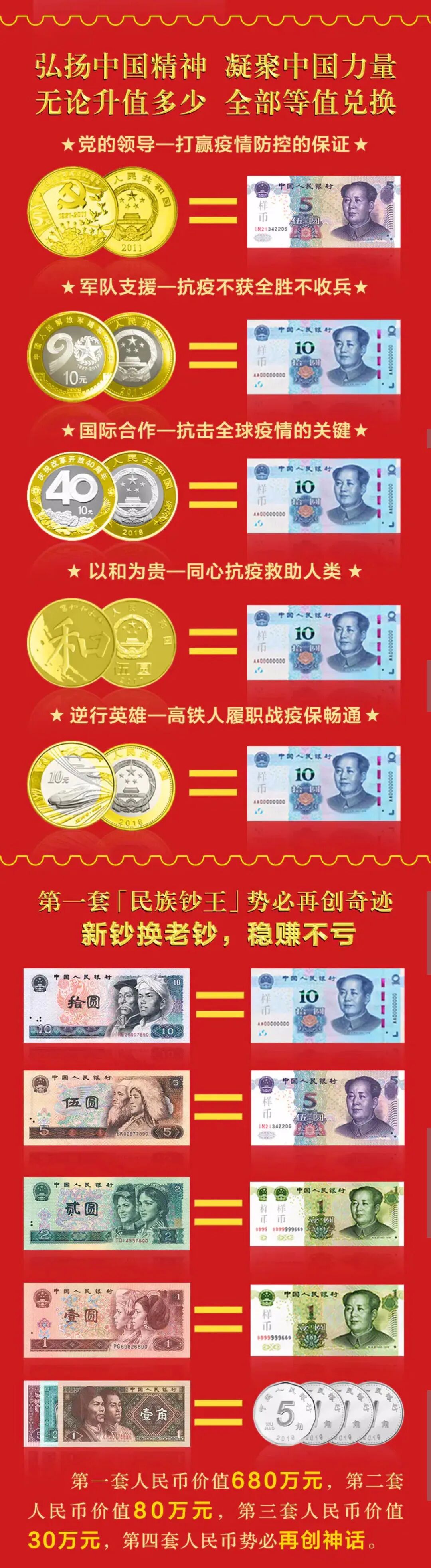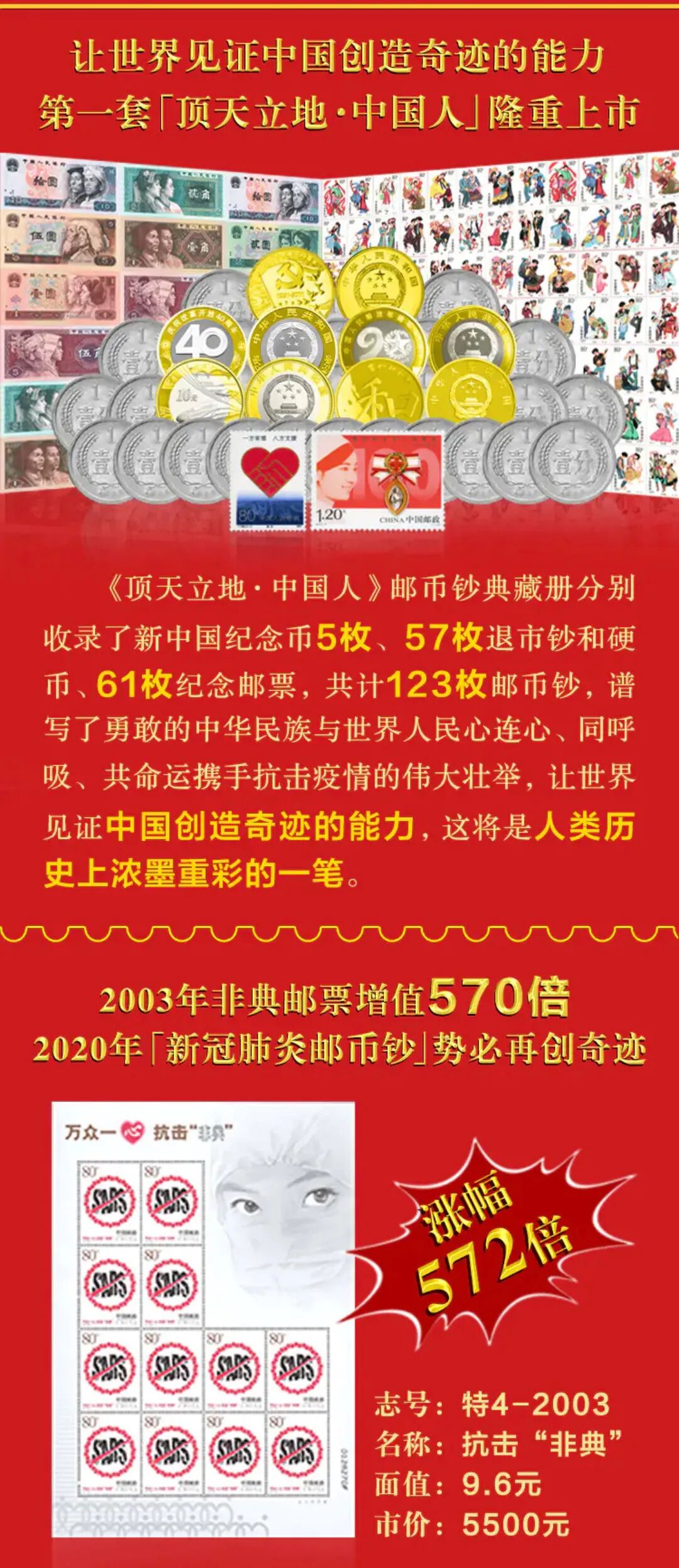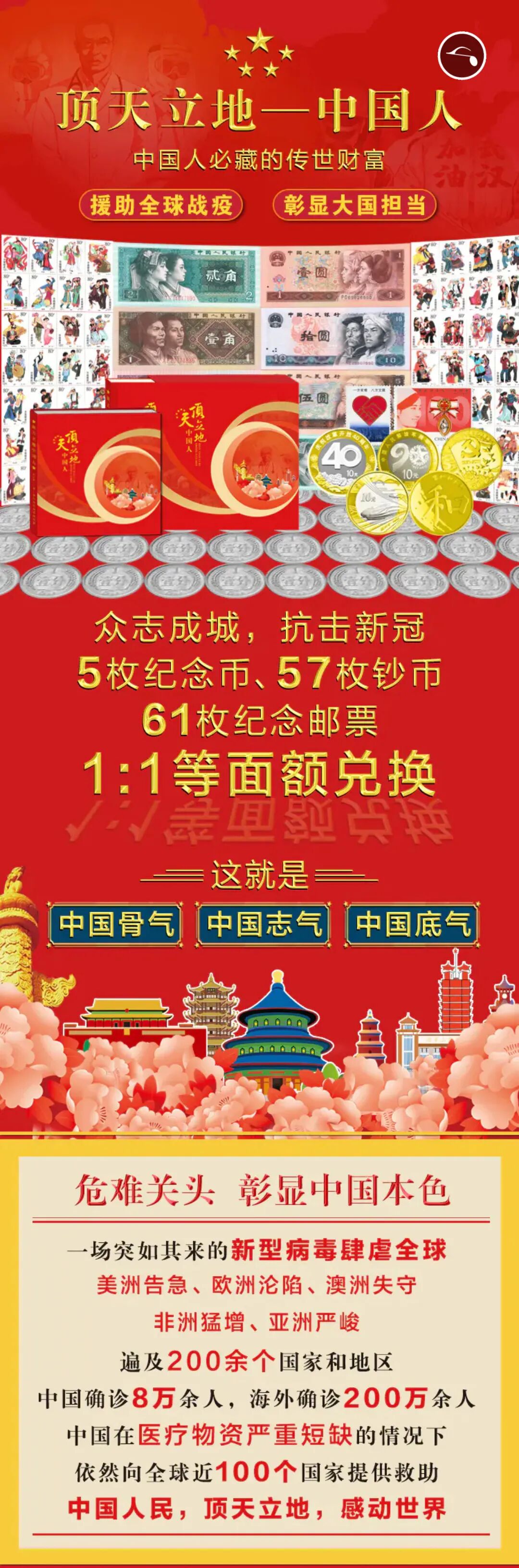 好东西来了,中国第1套抗击抗疫邮币钞典藏册《顶天立地中国人》近日发行了,典藏册分别收录了新中国纪念币5枚、57枚退市钞和硬币、61枚纪念邮票、共计123枚邮币钞,谱写了勇敢的中华民族与世界人民心连心、同呼吸、共命运携手抗击疫情的伟大壮举,让世界见证中国创造奇迹的能力,这将是人类历史上浓墨重彩的一笔。