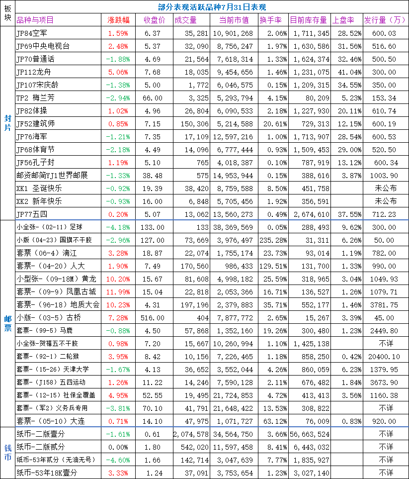热门品种板块,微涨,横盘震荡,邮票表现稍好,62个品种,涨跌平比为28/32/2,涨幅最大的为套票凤凰古城收涨11.99%,跌幅最大的为JF9广告收跌-5.08%。封片方面,涨少跌多,表现弱于昨天,龙舟、中央电视台、空军等买盘积极表现较强,回调几天的巫山小三峡A积极反弹,涨幅居前。小盘品种广告、珠峰跌幅居前。邮票方面,整体表现较好,强势品种活跃。凤凰古城、地质大会、社保全覆盖、二轮猴等有较强表现,买盘积极,鸡小版、义务兵专用等小幅回调休整。钱币方面,二版壹分,卖压较重,小幅回调,收于0.61元。