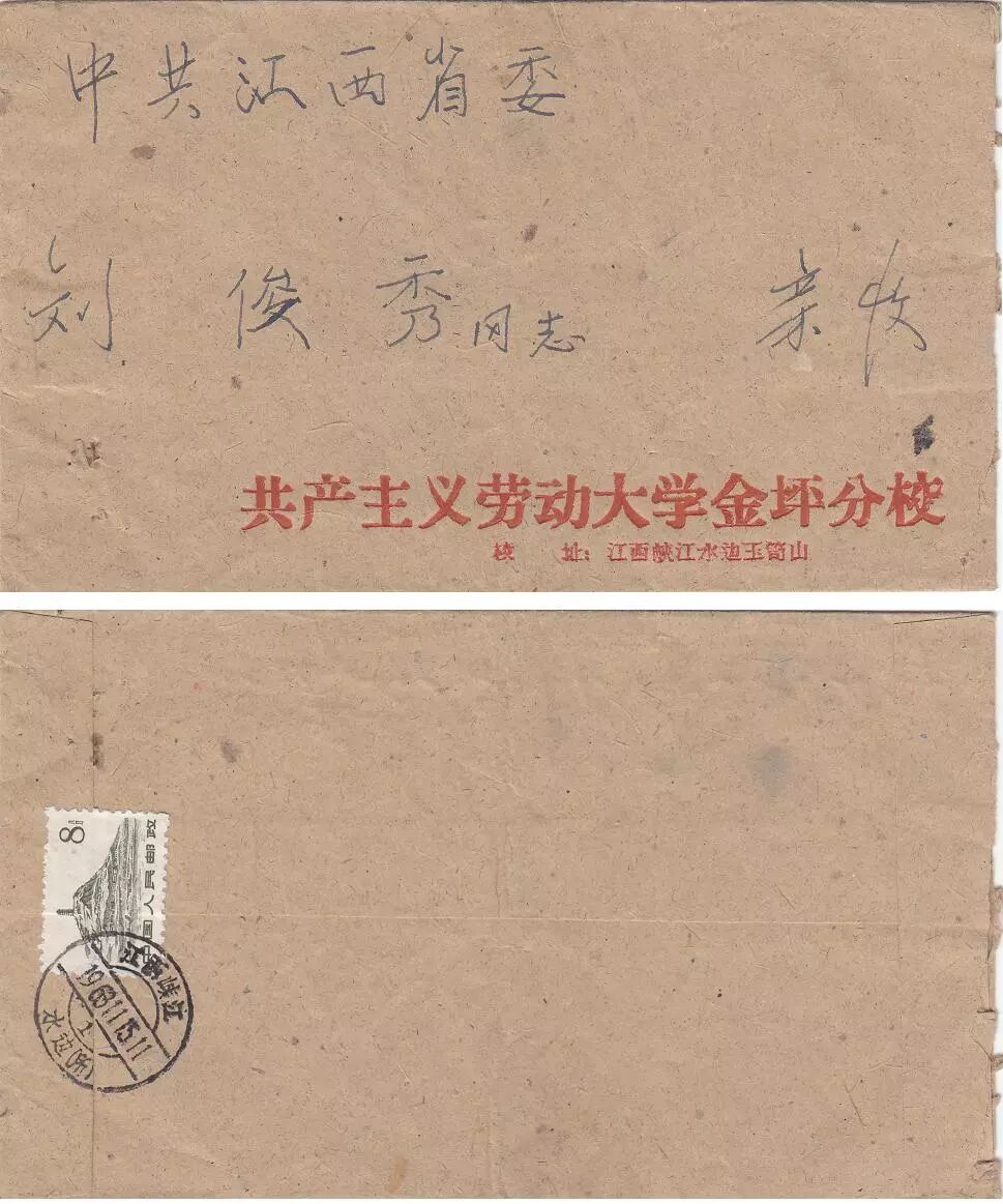 另一件假戳封同样出自江西峡江金坪,这次是共产主义劳动大学金坪分校寄出,销戳为“江西峡江 水边 ”通框式日戳。