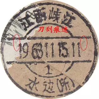 本来就是一件普通的腰框式日戳,被人将腰框两侧的竖线用刀刮去,再用黑笔手工将上下两线延长至戳边,不仔细看,难看出来。