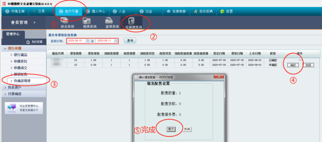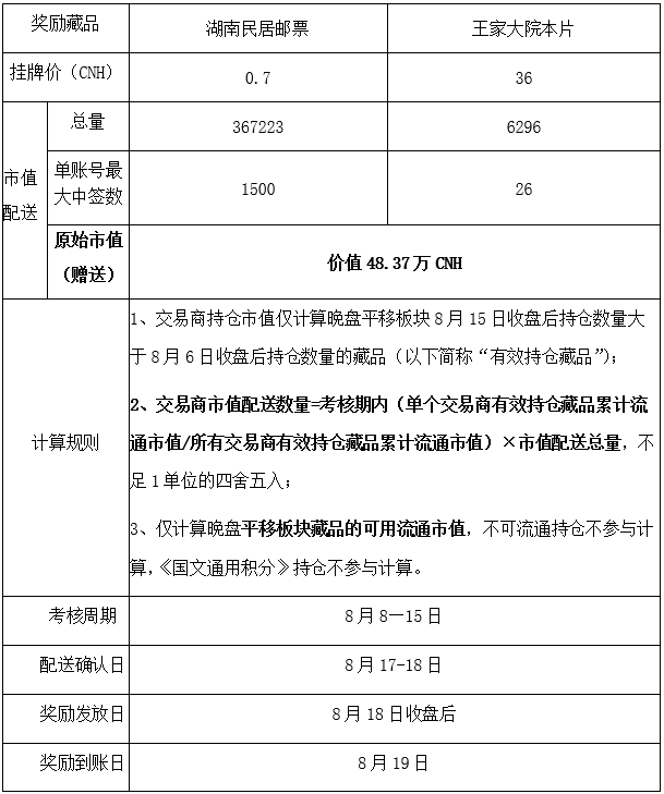 2020(交)第427号 关于开展晚盘平移板块市值配送活动的公告 日期:2020-08-08 来源:gjwjs 尊敬的交易商:为推动市场健康发展,经交易商及服务商共同申请,本所研究决定,将第419号“晚盘平移板块八月份市值、交易额配送”活动调整为“晚盘平移板块市值配送”活动,详情如下:(一)活动详情:注:CNH为离岸人民币的缩写。(二)配送确认及奖励到账:1、配送确认获得赠送奖励交易商可于8月17日—18日9:00-21:00登录电脑客户端,进入客户平台→投资类系统→待确认增发,对“配送藏品、数量”进行确认操作。(查询日期选择“8月17日—18日”)2、 配送到账本所将于8月18日收盘后办理配送到账业务,次日可进行交易,如过期未进行“配送确认”操作,则视为放弃参与本次活动。本所保留对此活动的最终解释权。注:本所提醒广大交易商投资有风险,请理性参与,控制风险。 中国国际文化产权交易所2020年8月8日