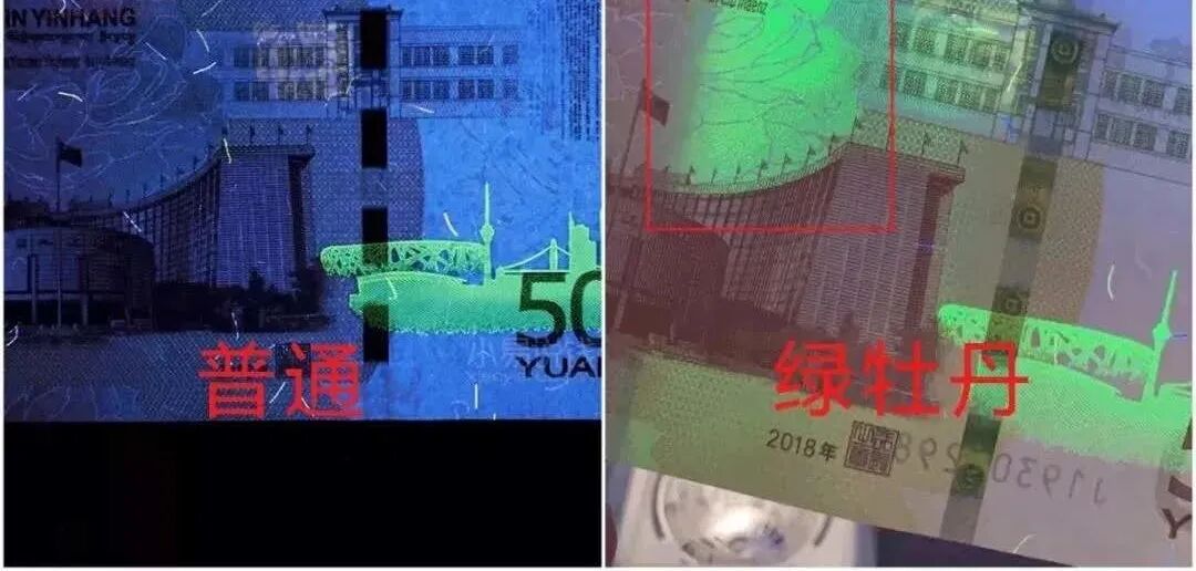 相比于普通的70钞,绿牡丹的牡丹花图案在荧光灯下呈现一半绿色荧光一半暗的状态,故此得名。