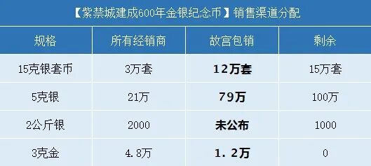 根据金总发布的销售渠道,统计了一下,这次的紫禁城纪念币,故宫包销了大部分,光5克银就占了90% 。