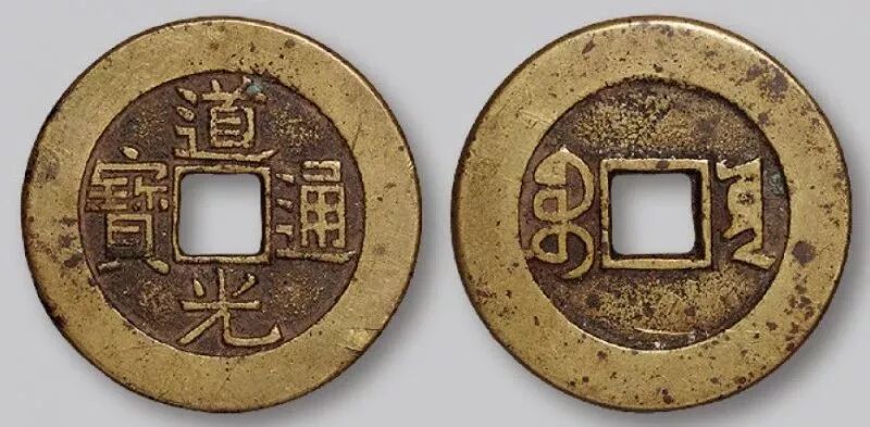 道光通宝,钱文为楷书,背满文记局,有“泉、源、直、陕、苏、浙、昌、广、桂、晋、川、武、福、云、东、南、黔、新、伊、库车、阿克苏”共21种。