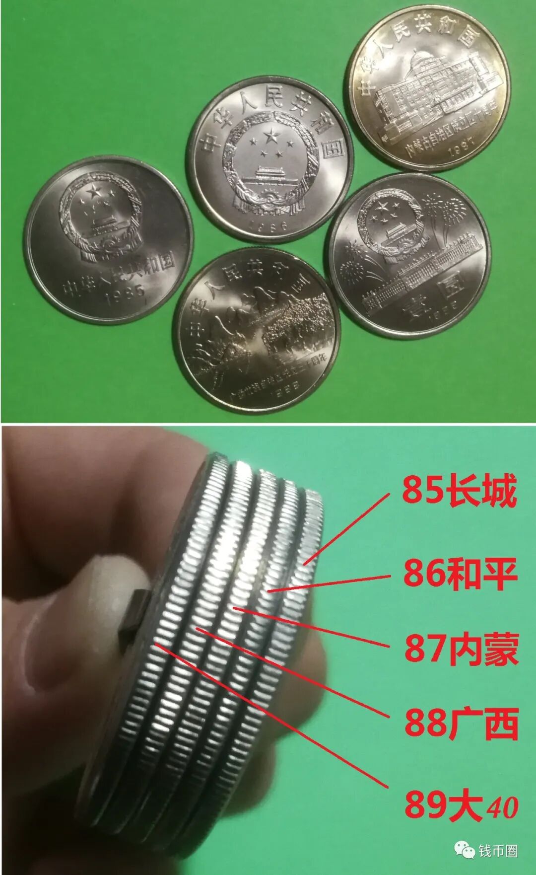 851的宽窄版是流通硬币中最明显的版别差异(可以开启你硬币版别收藏的大门,因为其他异版别币要么差别较小、难被注意;要么特别稀有、价格太贵)。其中宽版是沈阳造币厂所生产,窄版为上海造币厂所生产。而85年的角币都是沈阳造币厂所生产的。也就是上币厂85年仅生产了壹元这一种面额。这有些反常。因为不论是普币还是精制币,80~84的五年,两个造币厂都会单独生产各年长城币所有面值的币种。如普币81年为沈币厂生产,80、83年为上币厂所生产。上币厂85年仅生产壹元,这里面有怎样的玄奥呢?其实,在当时的年代,长城币在日常生活中的地位比较尴尬。工资袋里、百货大楼的交易,长城币是不受待见的。因为见过的人少,好多人不把它当流通币看,买东西时常被拒收,或找零时不愿意要,有时被认为是“纪念币”。没见过谁拿纪念币去买东西的。851窄版,可能是国家(中国人民银行)想透露给我们的,长城币制造成本很高,并不很适合市场流通,人们还是应该把它当纪念币好好收藏(对长城普币的收藏也是日后从国外找回长城套币的基础)。既然如此,可以认为窄版851是最具有纪念币意义的流通硬币。于是我把窄版851和纪念币放一起观察和比较。人民银行在84~89年发行了与长城币壹元相同直径、相同材质的纪念币。我手上有几枚价格便宜的,比较结果印证了我的预想(如图5所示)。