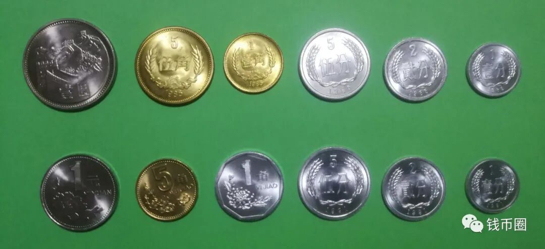 图3 85年“流通套币”和91年套币面值的对比(笔者藏品实拍。老三花中5角比1角还小,也能反映铜锌合金铸币成本是高的。)