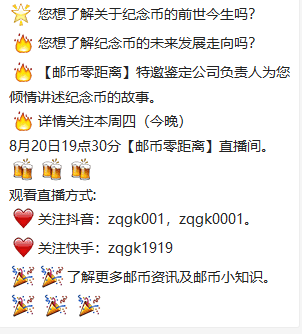 今晚邮币零距离直播中将邀请到钱币鉴定公司负责人给大家介绍纪念币的前世今生和未来发展走向,值得期待。