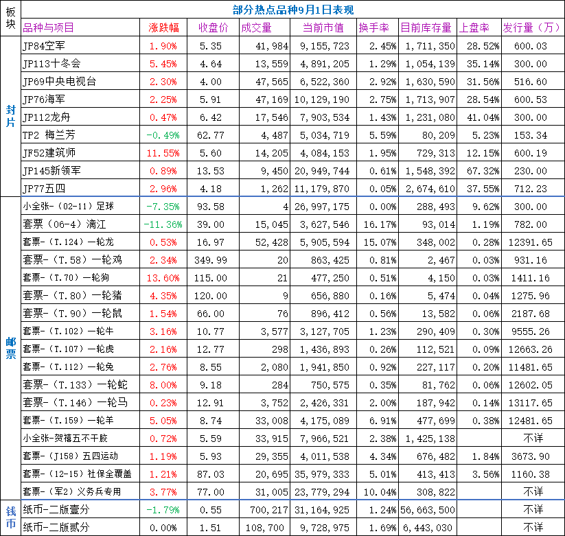 邮票板块:微跌横盘,整体表现不佳,但有一个亮点是生肖系列邮品表现积极,一轮生肖套票全部收涨,多个品种表现积极,如一轮羊、一轮牛等,其他如三轮龙小版,三轮龙套票等也表现较积极,一轮龙套票,微涨,买盘谨慎。热门品种中国梦(一)、黄龙、义务兵专用、第十届中国艺术节等表现较好,社保全覆盖28连涨,延续上行。多数此前较活跃强势的套票品种仍表现欠佳,如五四运动、贺禧五不干胶、八届人大、二轮猴等。