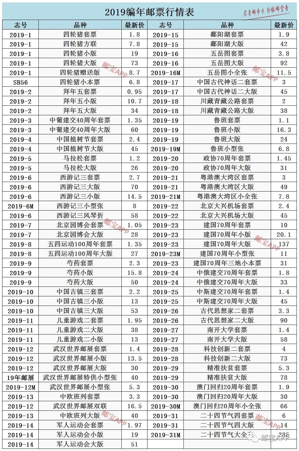 2019年编年邮票最新行情表 日期:2020-12-04 特别提醒:邮宝APP中所有产品的价格为市场大宗交易价格、且不含税点。零售价可能在此基础上浮动10-20%。另外,因篇幅所限,本文亦未列出邮币卡的所有品种。查询更多价格,请登录邮宝APP行情 2019年编年邮票最新行情表