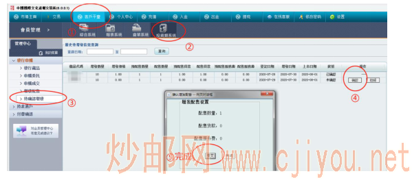 電腦客戶端操作確認方式:登錄電腦客戶端→進入客戶平臺→投資類系統→待確認增發→對“配送藏品、數量”進行確認操作。