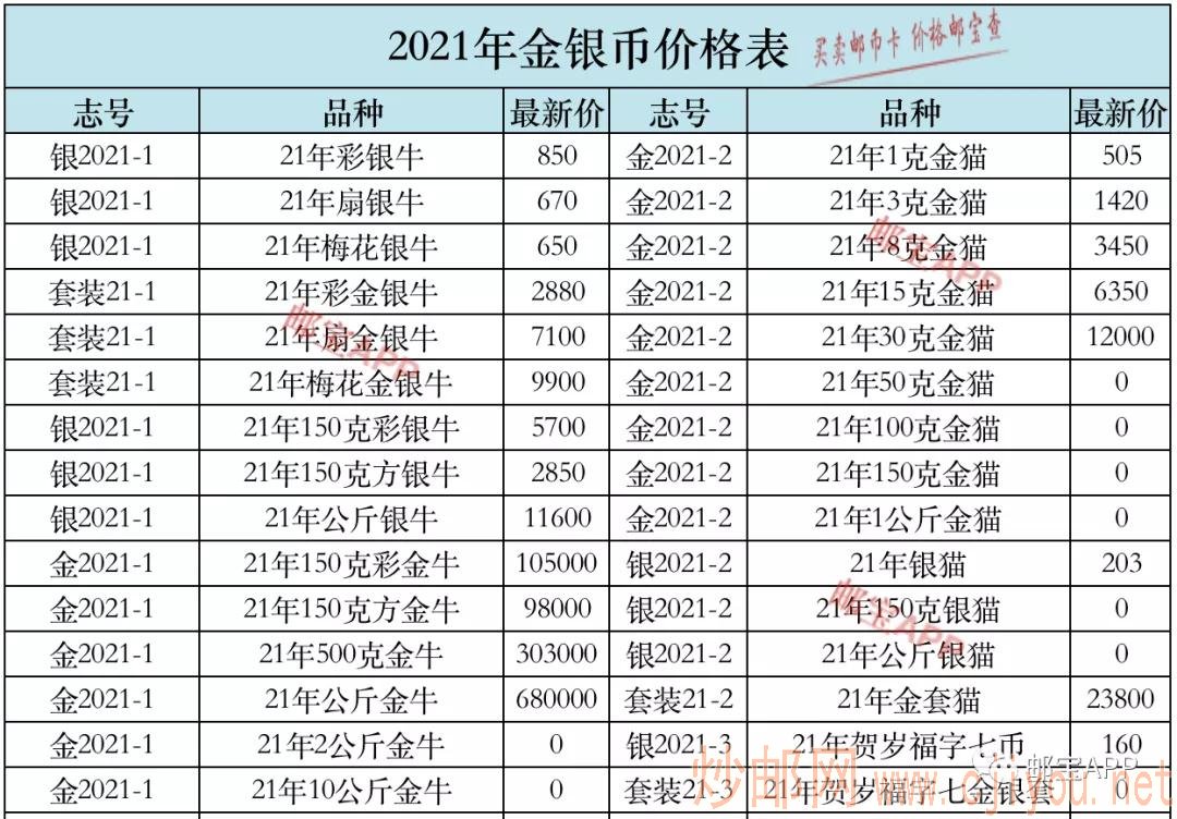 2021年金银币最新行情 日期:2021-01-08 2021年金银币最新行情 邮宝APP 特别提醒:邮宝APP中所有产品的价格为市场大宗交易价格、且不含税点。零售价可能在此基础上浮动10-20%。另外,因篇幅所限,本文亦未列出邮币卡的所有品种。查询更多价格,请登录邮宝APP行情小版 2021年金银币最新行情表 注:转发或引用内容文字或图片请注明出处为邮宝APP