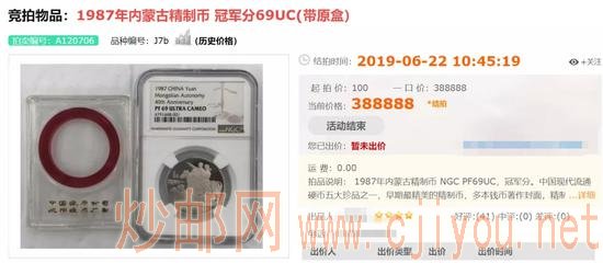 去年6月,一枚NGC69分冠军分的内蒙古精制币,以38.8888万元的价格拍卖成交!