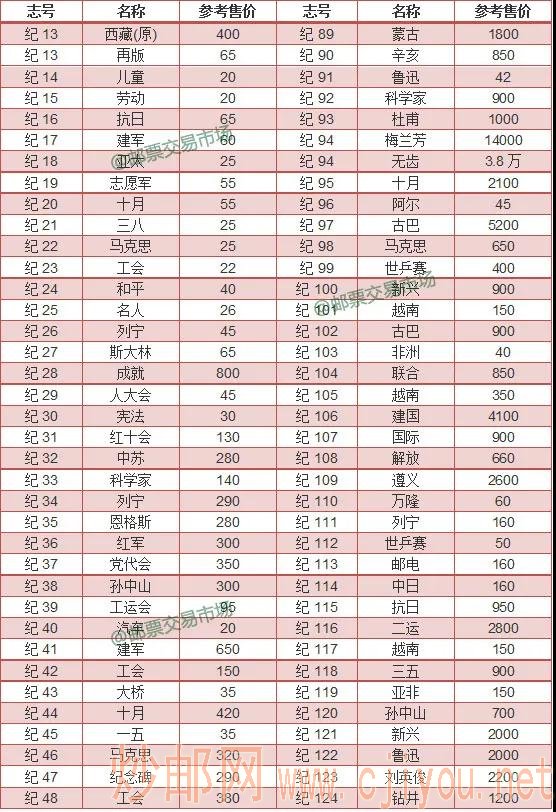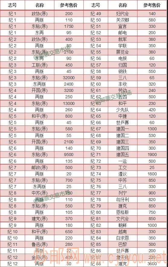 1949-1967年“纪”字头邮票1月价格播报(老纪特)