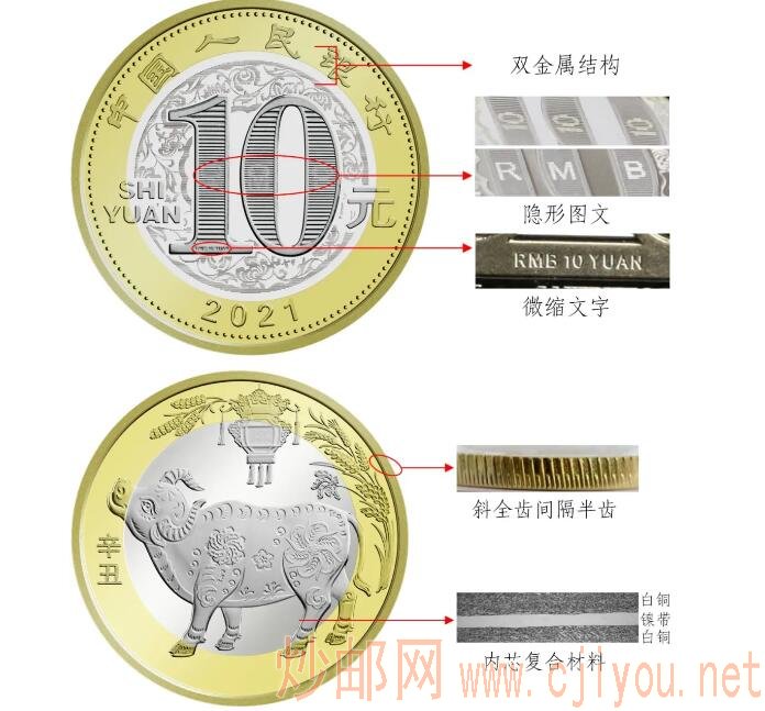 “二牛”币的防伪特征 日期:2021-01-21 “二牛”币的防伪特征 中国人民银行 8090集邮 传说中的2021年贺岁普通纪念币终于揭开属于自己的面纱,那么这款纪念币的防伪特征,各位先行了解一下。 一、双金属结构和内芯复合材料硬币外环为黄铜合金,内芯为具有独特机读性能的镍带复合白铜材料。二、斜全齿间隔半齿硬币外缘分布有交替排列的斜全齿与半齿。三、隐形图文将硬币倾斜适当角度,可在正面面额数字“10”的轮廓线内,观察到两组由3个“10”“RMB”构成的隐形图文。四、微缩文字在硬币正面面额数字“10”的底端,可观察到“RMB 10 YUAN”的微缩文字。 来源:中国人民银行 整理:8090集邮 欢迎转载,注明出处
