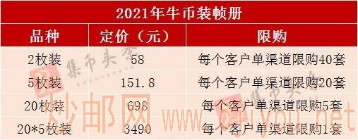 本次牛币装帧册共有4个规格,分别为2枚装、5枚装、20枚装、20枚*5装,销售价格如下: