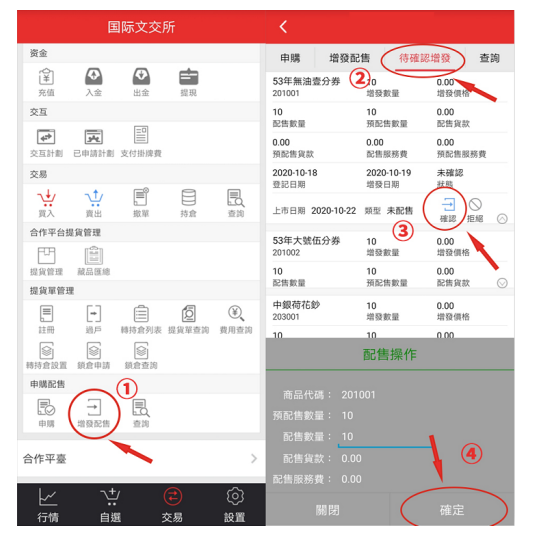 手機APP操作確認方式:登錄手機APP→增發配售→待確認增發→點擊下拉箭頭→對“配送藏品、數量”進行確認操作。