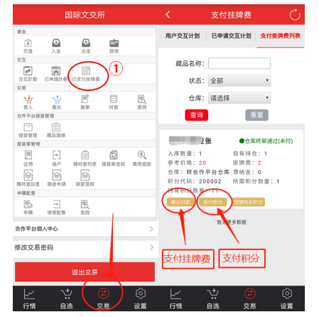 登錄手機APP—交易—交互—已支付掛牌費—點擊“確認付款”支付掛牌費、點擊“支付積分”支付掛牌積分。