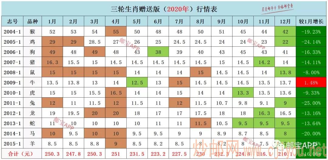 三轮生肖赠送版2020年全年行情汇总 日期:2021-02-20 三轮生肖赠送版2020年全年行情汇总 邮宝APP 特别提醒:邮宝APP中所有产品的价格为市场大宗交易价格、且不含税点。零售价可能在此基础上浮动10-20%。另外,因篇幅所限,本文亦未列出邮币卡的所有品种。查询更多价格,请登录邮宝APP行情三轮生肖赠送版2020年全年行情汇总 注:转发或引用内容文字或图片请注明出处为邮宝APP