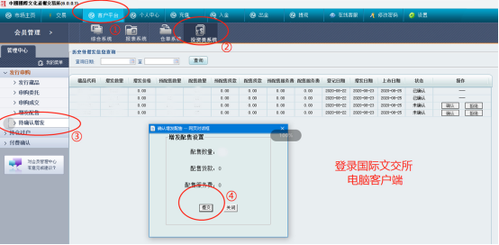 電腦客戶端操作確認方式:登錄電腦客戶端→客戶平臺→投資類系統→待確認增發,對“配送藏品、數量”進行確認操作。