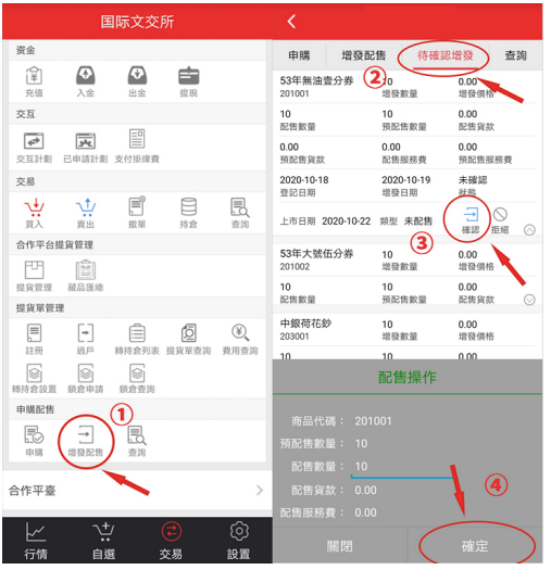 手機APP操作確認方式:登錄手機APP→增發配售→待確認增發→點擊下拉箭頭→對“配送藏品、數量”進行確認操作。