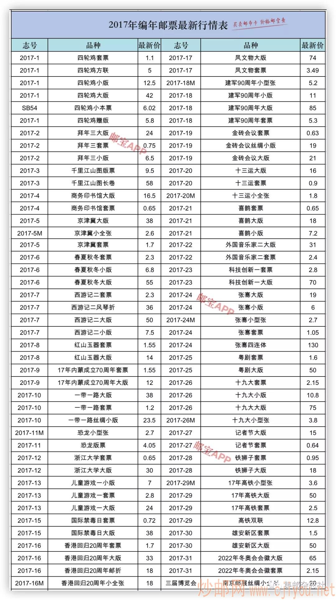 市场:2017年编年邮票市场行情 日期:2021-03-02 市场:2017年编年邮票市场行情 集邮杂志社 今天,通过“邮宝”APP为大家查询了邮票2017年编年邮票的市场行情供大家参考。 查询更多邮票、钱币、纪念钞、金银纪念币以及磁卡的价格,请登录“邮宝”APP。