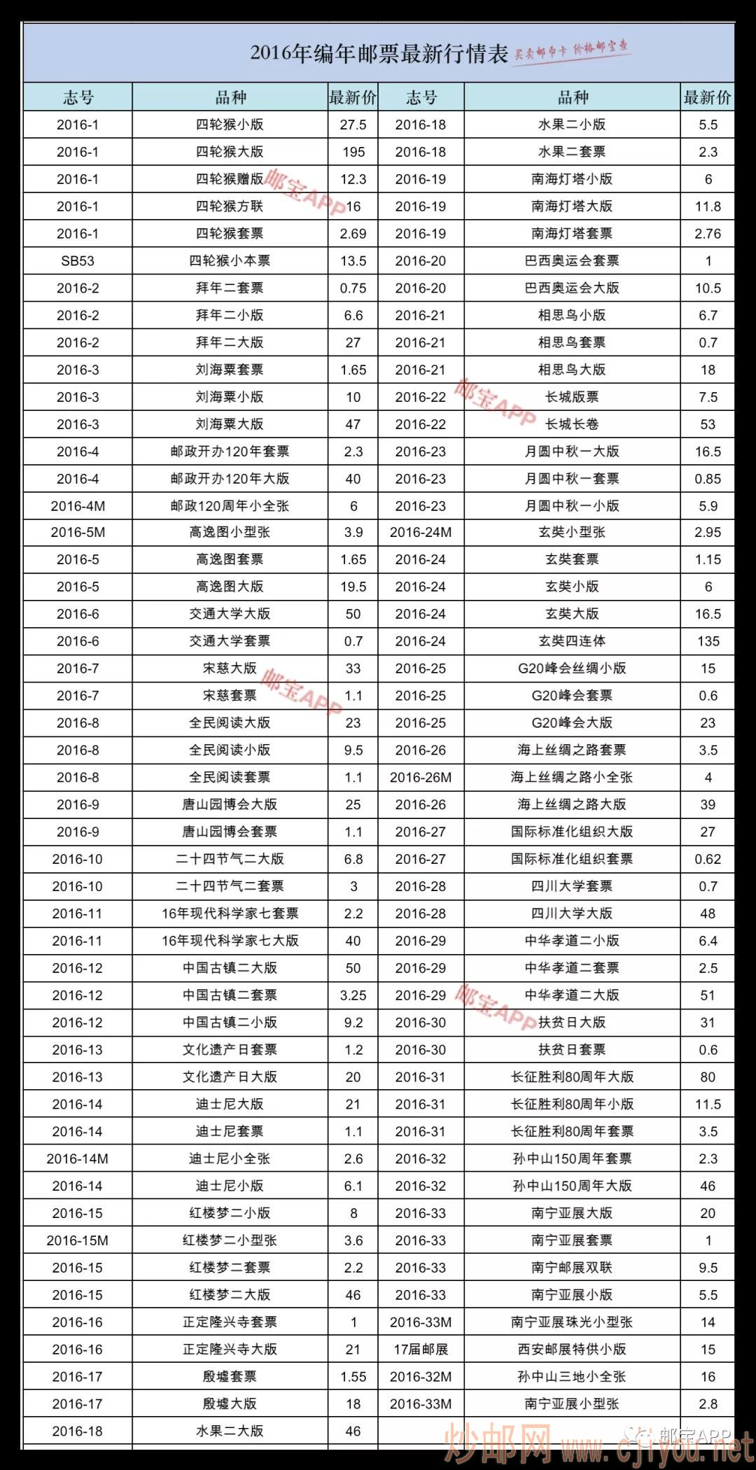 2016年编年邮票最新行情 日期:2021-03-05 2016年编年邮票最新行情 邮宝APP ·· 特别提醒:邮宝APP中所有产品的价格为市场大宗交易价格、且不含税点。零售价可能在此基础上浮动10-20%。另外,因篇幅所限,本文亦未列出邮币卡的所有品种。查询更多价格,请登录邮宝APP