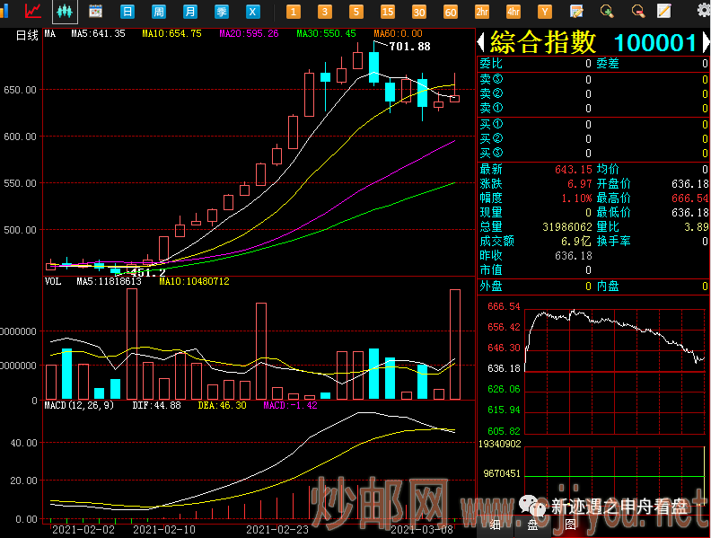 白盘早盘受周六夜盘大幅火爆走势影响,以及周末各路媒体的大力宣传,开盘便快速冲高,不到半小时涨幅就高达4%点多,基本达到全日最高。