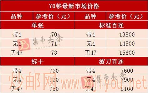 最近70钞的行情表现比较稳健,带4的单张价格在70元左右,标十价格在720~730左右,号码无47的价格明显高于带4或7的。