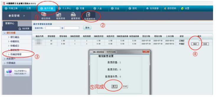 電腦客戶端操作確認方式:登錄電腦客戶端→進入客戶平臺→投資類系統→待確認增發→對“配送藏品、數量”進行確認操作。