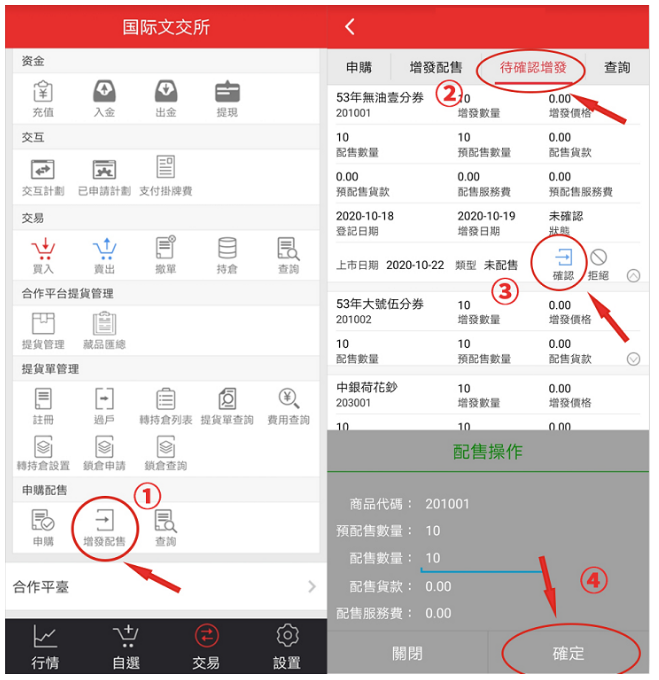 手機APP操作確認方式:登錄手機APP→增發配售→待確認增發→點擊下拉箭頭→對“配送藏品、數量”進行確認操作。