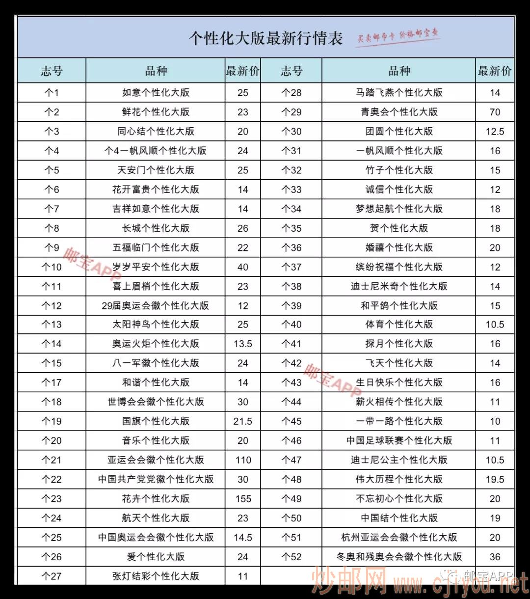 个性化大版最新行情 日期:2021-03-28 个性化大版最新行情 邮宝APP ·· 特别提醒:邮宝APP中所有产品的价格为市场大宗交易价格、且不含税点。零售价可能在此基础上浮动10-20%。另外,因篇幅所限,本文亦未列出邮币卡的所有品种。查询更多价格,请登录邮宝APP