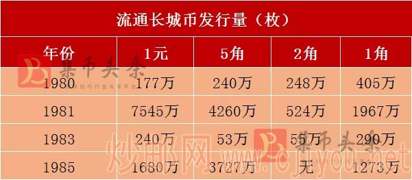 长城币中,只有80、81、83、85这4个年份的硬币发行了流通硬币,所以发行量相对精制币来说,还算比较大,价格也相对低一些。