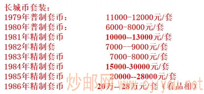 其次是85年和84年精制套币,价格基本稳定在上万元;81年的市场表现也相当不错,价格在1~1.3万左右;80年、82年、83年精制套币的市场行情相对弱一些。