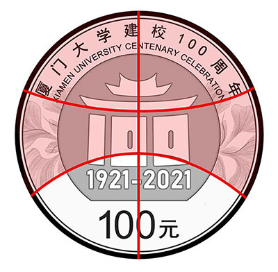 这条弧线我并没有刻意去调整位置,却恰好处于币面的黄金分割处,自然地将画面分成了上下结构,与中英文主题文字形成上紧下松的构图。弧线上方勾勒出的完美扇形宛如一只正在开屏的孔雀,为厦门大学百年华诞庆生喝彩。