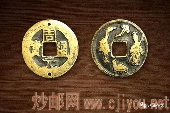 (图1:周元通宝背龟鹤祥云人物花钱)