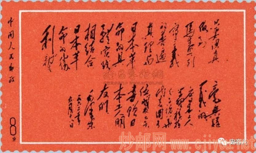 为了纪念毛主席为日本朋友题词6周年,邮电部计划于1968年9月18日发行1枚纪念邮票。票面上印有毛主席1962年9月18日的题词手迹。面值8分。红底黑字,集邮界俗称“黑题词”。该票准备发行之际,日本政府抗议,指责中国输出革命,此套邮票被停售收回。在1968年至1969年间,该票在河北保定、石家庄一带邮局出售过,传世不过10枚。