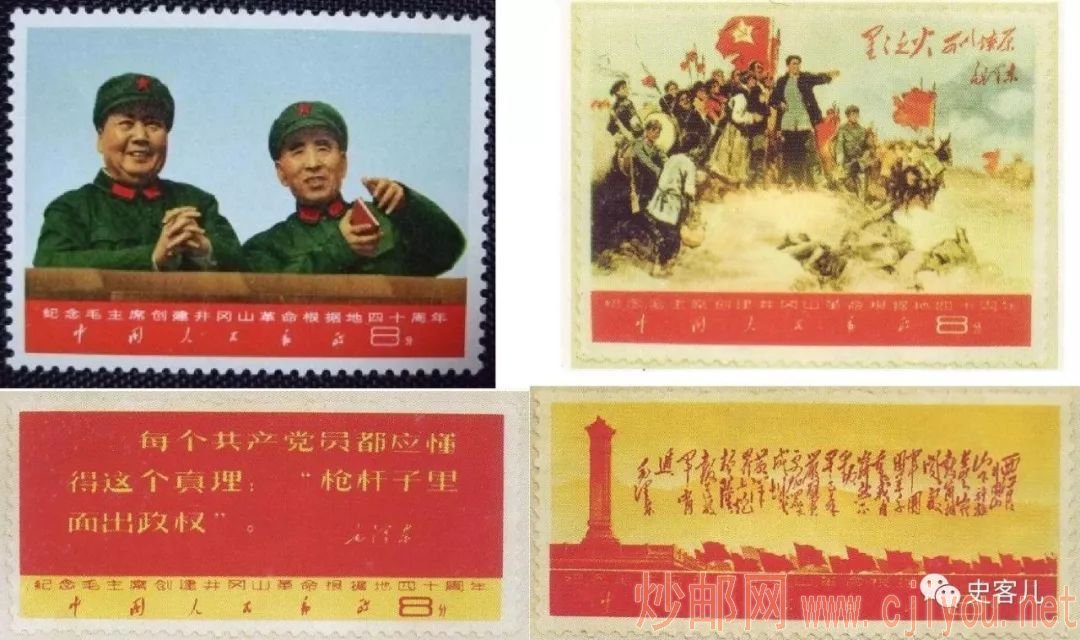 1966年8月初召开的八届十一中全会上,毛泽东突然写了《炮打司令部——我的一张大字报》,随后刘少奇从党内第二位降到第八位;朱德降到了第九位,排在了刘少奇的后面;而林彪则从第六位一跃成为第二号人物。1967年9月,为纪念井冈山革命根据地创建40周年,根据当时的形势,邮电部设计印刷了一套纪念邮票《纪念毛主席创建井冈山革命根据地40周年》。