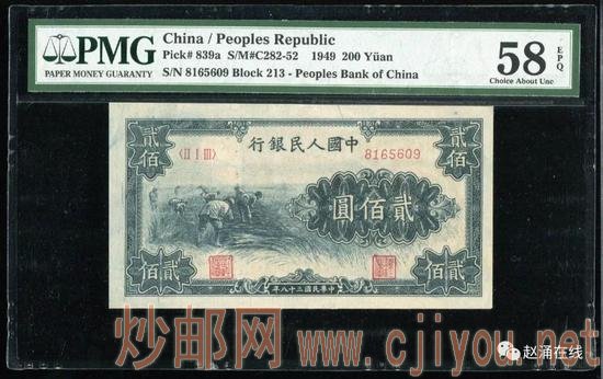 第一版人民币割稻200元一枚(ⅡⅠⅢ8165609、PMG 58EPQ)