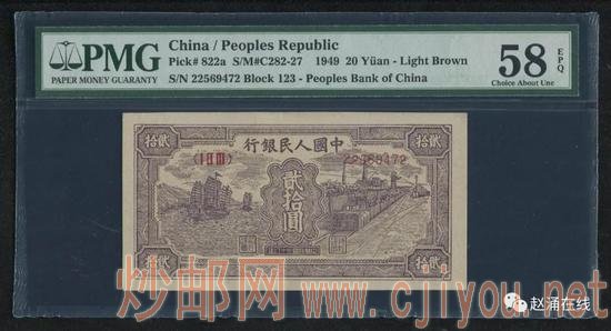 第一版人民币帆船与火车20元一枚(ⅠⅡⅢ22569472、PMG 58EPQ)