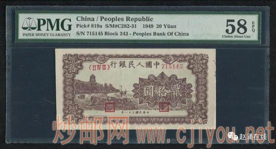 第一版人民币六和塔(咖啡色)20元一枚(ⅡⅣⅢ715145、PMG 58EPQ)