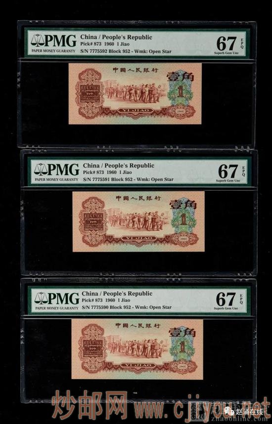 第三版人民币枣红1角连号三枚(ⅨⅤⅡ7775590-592、PMG 67EPQ)