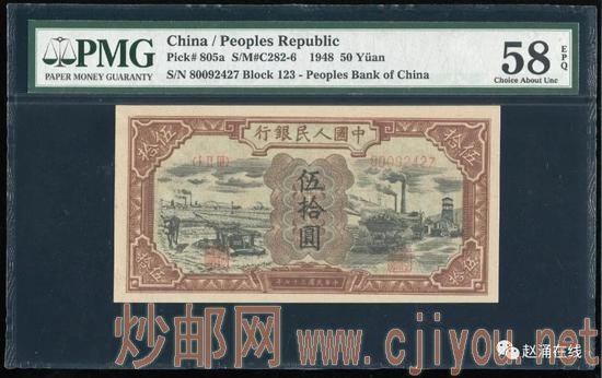 第一版人民币驴子与矿车50元一枚(ⅠⅡⅢ80092427、PMG 58EPQ)