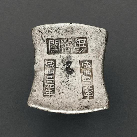 康熙十九年(1680年)开山东海禁后,二十三年(1684年)再开江苏、浙江、福建、广东四省之禁,并在松江、宁波、漳州、澳门设四海关,制定关税则例,对进出口货物课以税收。其中,设在澳门的粤海关业务最为发达,由户部授予海关监督权,委托其管理中外贸易事宜。鸦片战争以前,粤海关可以说是中国全权管理对外贸易的行政机关。此枚粤海关税锭,由鸦片战争以后本地商帮出口货物的关税销铸而成,作为中国海关税锭重要品种,历来为藏家所珍视。