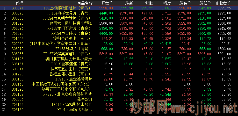 二、上邮今日大盘指数下跌-0.3%,涨跌平比12:15:43。一轮马套票、社保全覆盖、清华大学横盘调整;鸡血石印、兰花窄幅震荡,尾盘收红;建国60周年加字、捣练图、千里江山图买盘较弱,继续震荡下行。