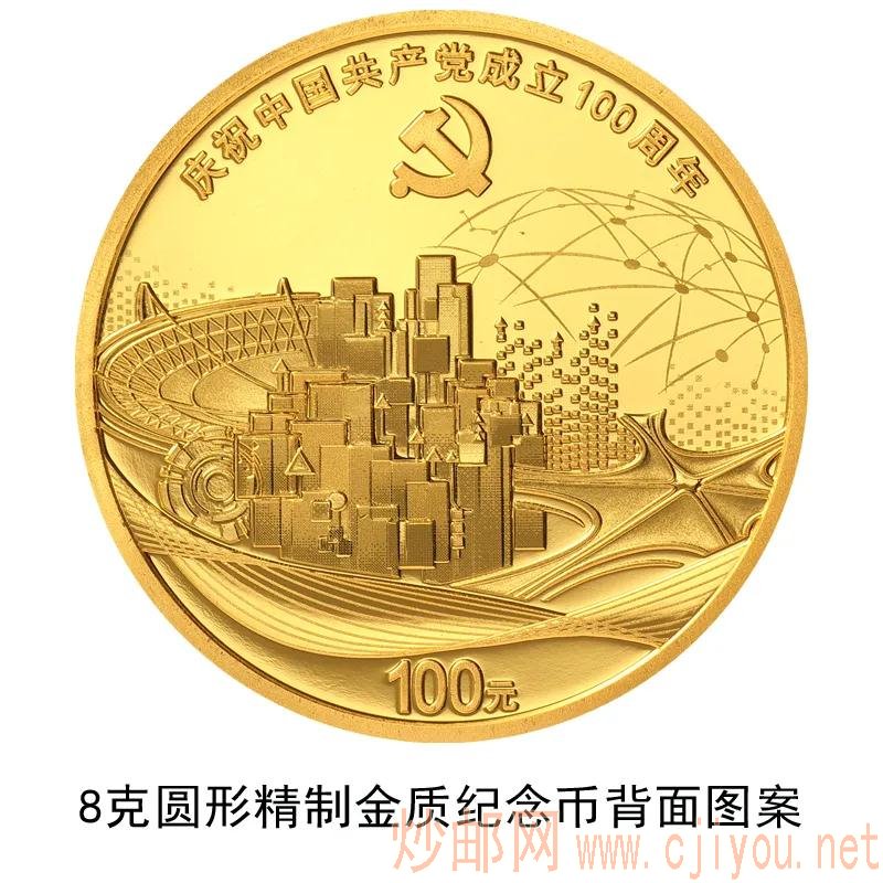 8克圆形金质纪念币背面图案为党徽、城市建筑、高铁、绿水青山、美丽乡村、拓荒牛、飘带等组合设计,并刊“庆祝中国共产党成立100周年”字样及面额。